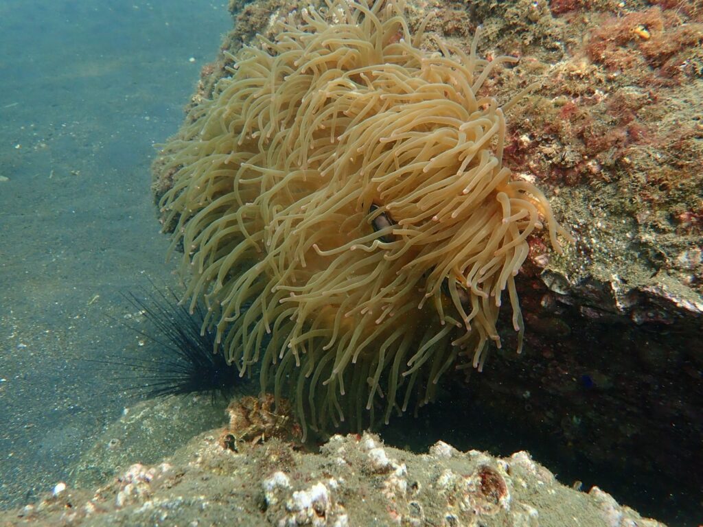 灰だらけの水中に鮮やか?に目立つのはイソギンチャク。