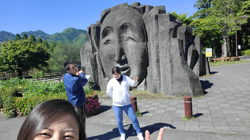 こちらは神楽のお面モチーフの石像。